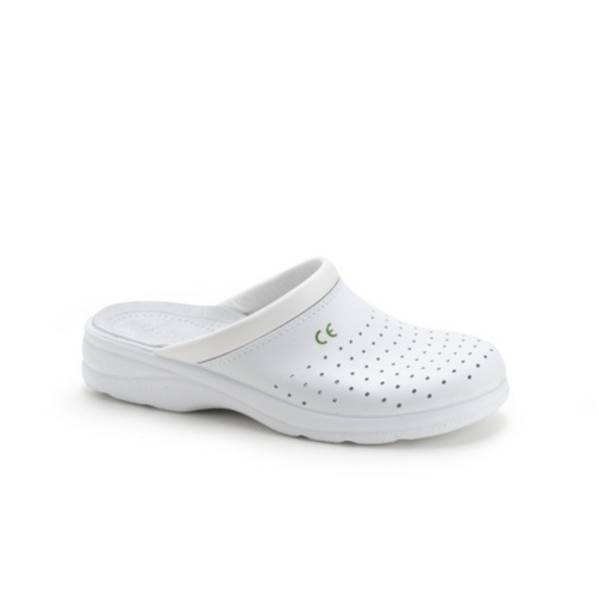 Zoccolo in pelle forata traspirante di colore bianco, ecologico, leggero e flessibile, alta resistenza all’abrasione, collo del piede imbottito, soletta in pelle anatomica e traspirante, suola in poliuretano monodensità, antiscivolo ed antistatica con assorbimento di energia nel tallone.